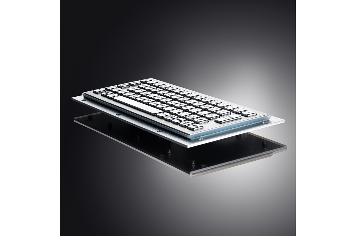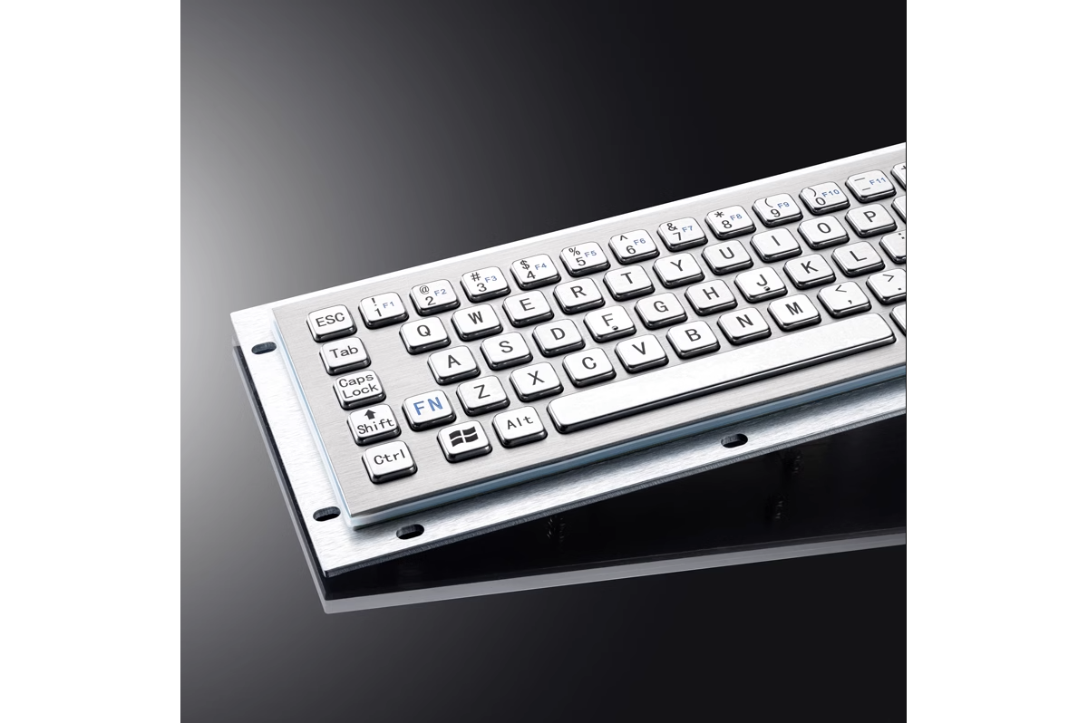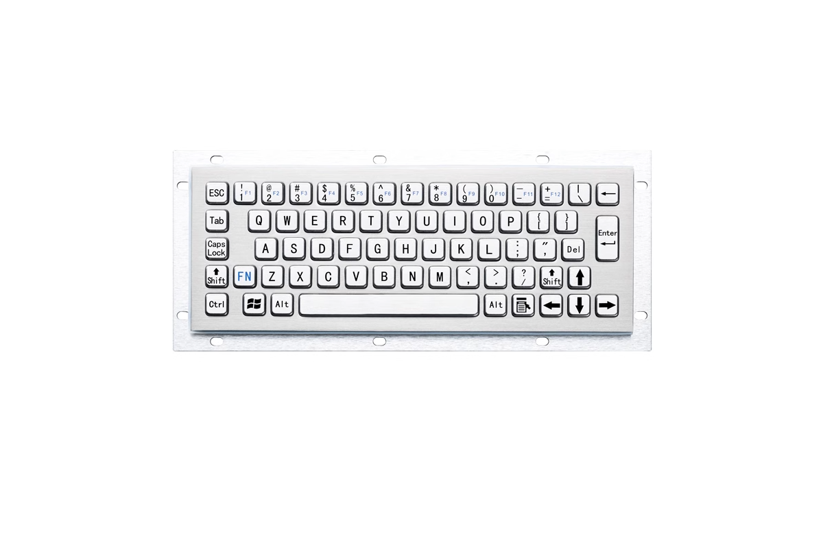 :IP65静态防水防尘防暴不锈钢金属工业键盘内置工业级沉金PCB控制板,65按键标准布局,采用硅胶凸按键技术,1.8mm长按键行程, 触感舒适,可进行快速精准输入。3.0mm厚氧化拉丝铝板带安装孔,下安装方式。